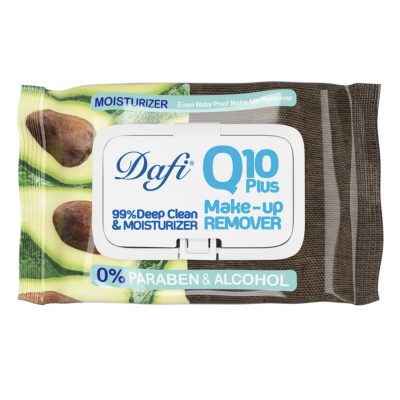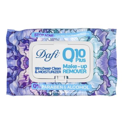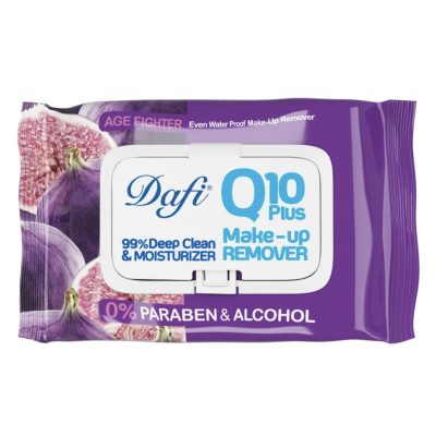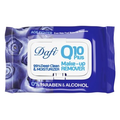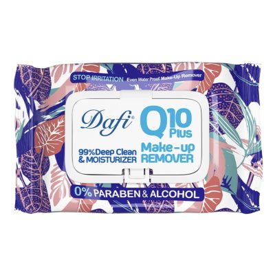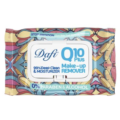 دستمال مرطوب پاککننده آرایش دافی مدل Q10، آرایش را بهراحتی پاک کرده و با کوآنزیم Q10 پوست را مرطوب و تغذیه میکند.