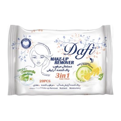دستمال مرطوب پاککننده آرایش دافی ۲۰ عددی، آرایش صورت و چشم را بهراحتی پاک کرده و پوست را مرطوب و نرم نگه میدارد.